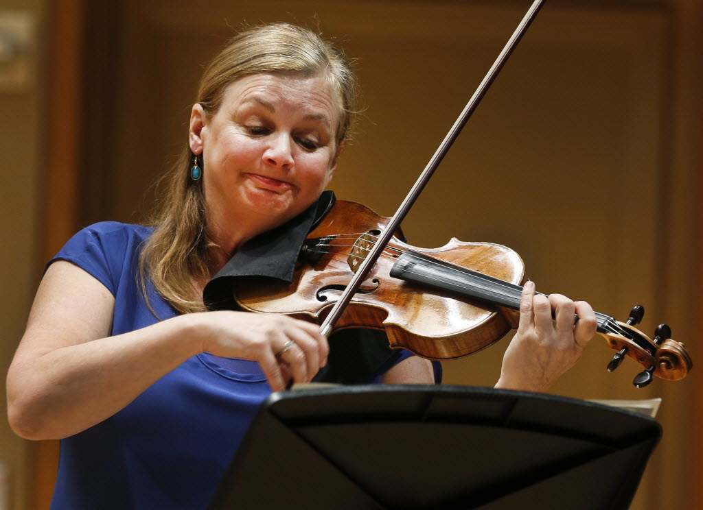 Margaret Batjer, concertmaster of the Los Angeles Chamber Orchestra, plays the the 1716 “Milstein” Stradivarius during a rehearsal at the Colburn School in Los Angeles. The violins of Antonio Stradivari, arguably the most famous instruments ever created, have an almost mystical reputation for beauty and heavenly tone. This week eight of them have been brought together in Los Angeles for “Strad Fest LA.” (AP Photo/Damian Dovarganes)