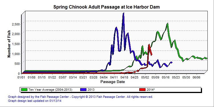 We have a very large pulse of fish passing Bonneville Dam (over 17,000 on one day on April 30) headed upstream, and we already have generally more than 1,000 per day passing Ice Harbor Dam. Counts at Little Goose are nearly 1,000 per day, and there are over 2,000 fish stacked up so far between Lower Monumental and Little Goose dams.