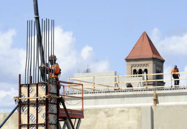 Within sight of the Clocktower, workmen guide pumped concrete into forms that will hold up the new hotel in downtown Spokane on Tuesday. (SR photo: Jesse Tinsley) \