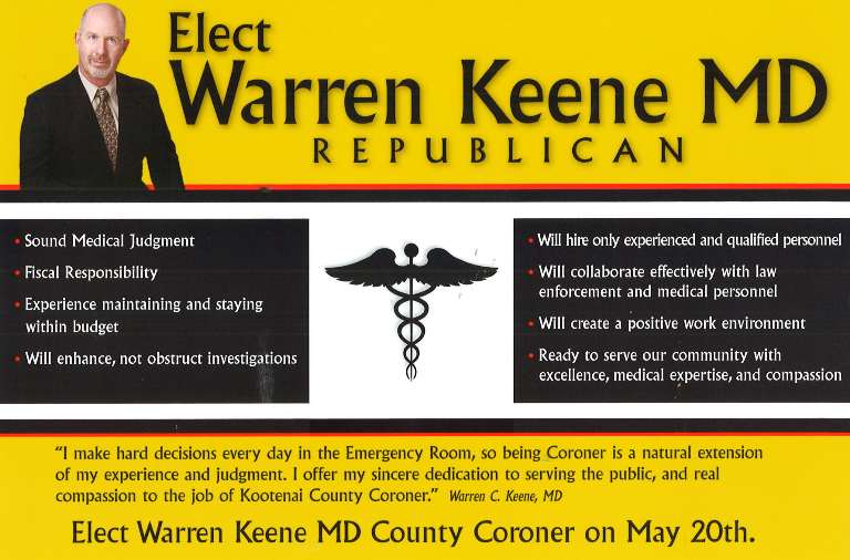 In the race for Kootenai County Coroner, Dr. Warren Keene is taking on incumbent Debra Wilkey. Keene has raised $7,017 to run for county coroner. The incumbent has raised $200. Keene has loaned $5000 to his campaign. He has received 3 contributions of $250 apiece from Dr. Neil Nemec, Dr. Michael Ettner and Dr. Eric Chun. You can see his campaign finance report here . Wilkey has received $100 apiece from Dr. Robert West and Bill & Jeri Douglas. You can see her report here .