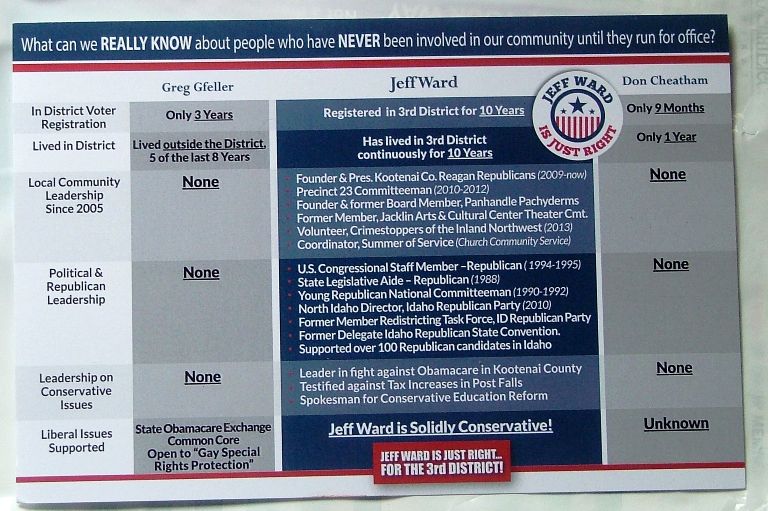 A Berry Picker writes, of this Jeff Ward flier that hit mailboxes this week: “This is very textbook on how to do ‘negative’ without trashing your opponents. Simply pointing out the differences. I thought this was very effective in highlighting the genuine lack of involvement and relatively brief time in the district of Ward’s opponents.”