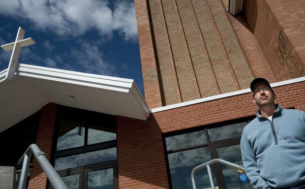 Pastor Craig Goodwin of Millwood Community Presbyterian Church stands in front of the graffiti-sprayed building Tuesday after it was painted with an anti-Christ symbol, left, and the phrase “skate or die.” A construction sign in the back of the church also was vandalized. More here . (SR photo: Tyler Tjomsland)