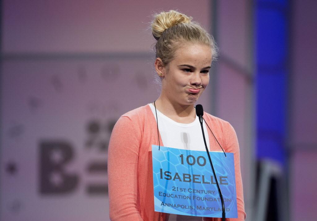 Isabelle Marie Simmons, from 21st Century Education Foundation, in Annapolis, Md., reacts after misspelling her word during the preliminaries, round two of the Scripps National Spelling Bee this morning at National Harbor in Oxon Hill, Md. You write the cutline. (AP Photo/Manuel Balce Ceneta)
