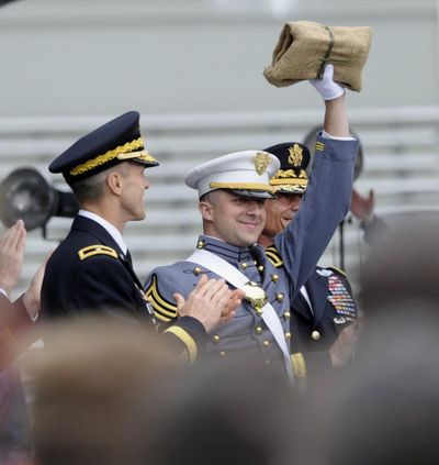 Matthew Mayeaux, the 2014 class “goat” who had the lowest GPA, holds up a bundle of money from his classmates after graduating from the U.S. Military Academy at West Point’s, in West Point, N.Y., Wednesday. President Barack Obama delivered the commencement address and talked about his Afghanistan plan and answered critics who say he has surrendered America’s global leadership. (AP Photo/Susan Walsh)