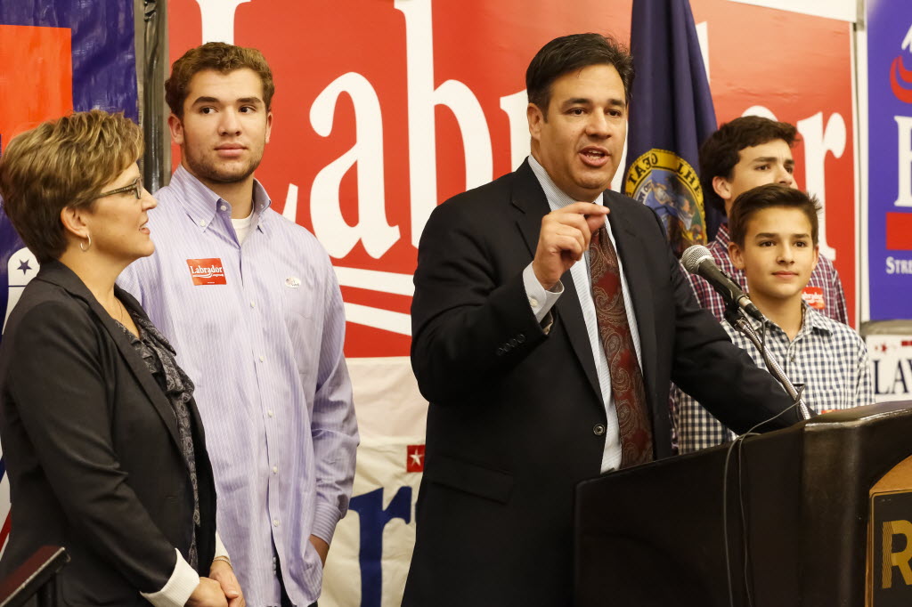 Rep. Raul Labrador, R-Idaho speaks after winning a third term during the Idaho GOP election night event Tuesday at the Riverside Hotel in Boise. (AP Photo/Otto Kitsinger)