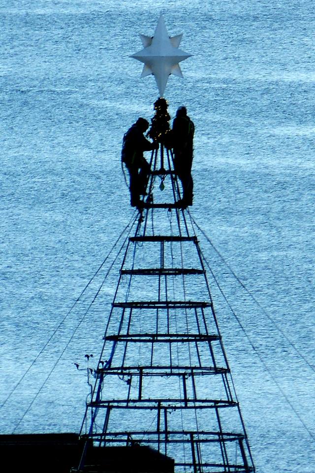 Photographer Don Sausser posts this morning: “On a 30 degree morning workers install the annual Christmas tree on Hagadone headquarters building.”