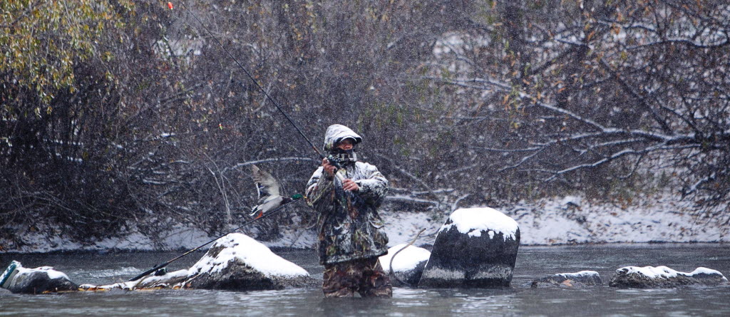 A duck flies behind a man fishing in the Boise River during an early season snowfall in Boise last week. (AP Photo/The Idaho Statesman, Kyle Green)
