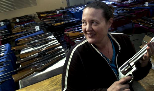 “If these guns could talk,” said Kym Nagel of Premier Auction Center, holding a Smith & Wesson 500 at the facility in Post Falls on Tuesday. (SR photo: Kathy Plonka)