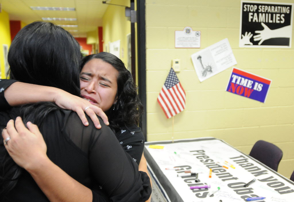 Laura Moreno, of Nampa, hugs her good friend Krista Busmante after watching President Obama’s speech on immigration reform Thursday at the Hispanic Cultural Center in Nampa. “It’s really big because families won’t get separated,” said Moreno. Moreno was nine years old when she came into this country illegally with her mother. The executive order issued by President Obama will keep families who have been in the country illegally for at least 5 years safe from deportation. (AP Photo/The Press-Tribune, Adam Eschbach)