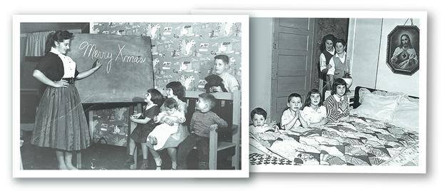 In these old family photos, Ellen Travolta, standing in both photos, is shown with her Travolta siblings, including youngest brother, John, who is seen sitting on Margaret’s lap (above left) and at the far left (right photo)