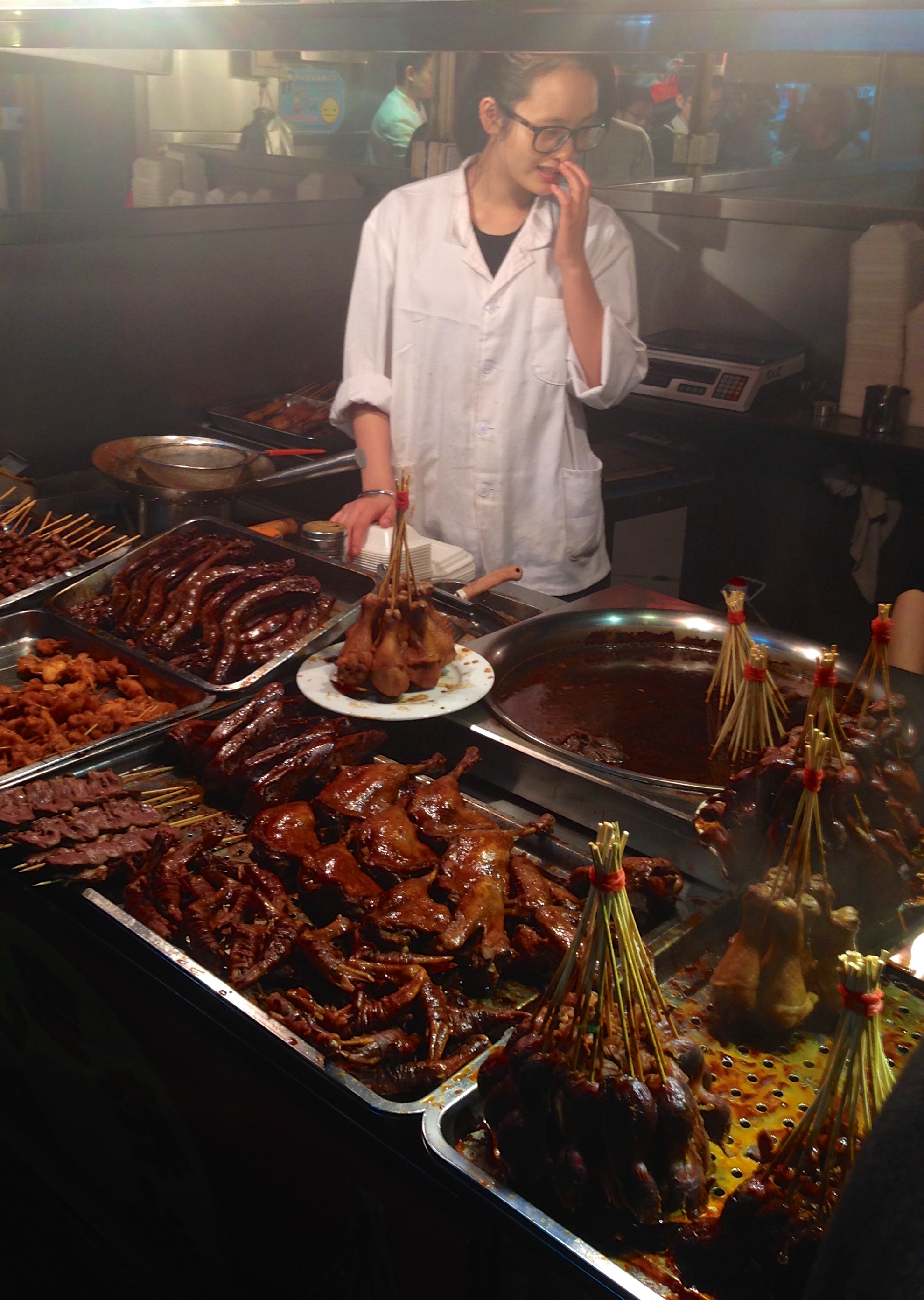 We walked the length and width of the district, sampling everything from fried tofu to grilled octopus and a curious kind of coconut drink, but mostly just indulging in the bustle of Shanghai street life. This included the multicolored lanterns lighting the narrow lanes, the smells of food and the sounds of everything from singers performing for whomever would listen to the ever-present honks of motorbikes and the scuffle of shoes on the hard stone sidewalks.
