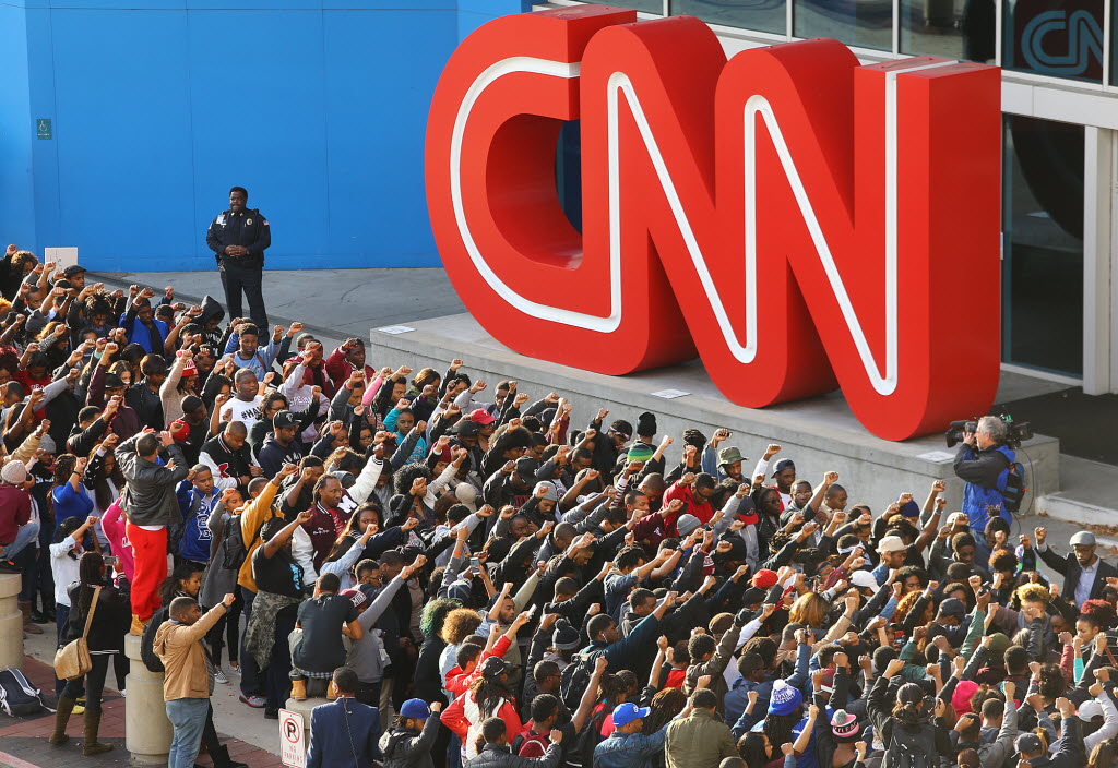 A law enforcement officer watches over Morehouse College students, who marched from campus, raise their fists in the air joining others in a rally and protest at the CNN Center, Tuesday in Atlanta, the day after a grand jury’s decision not to indict a white Ferguson, Mo., police officer who killed Michael Brown, an unarmed black teen. (AP Photo/Atlanta Journal-Constitution, Curtis Compton)