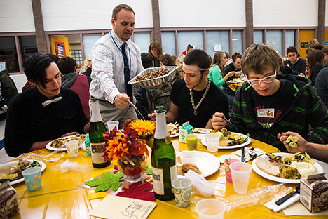 Venture High School Principal Mike Lindquist serves students Dakota Bailey, left, Jacob Kulczar, center, and Daniel Adamson potatoes during the Venture High School Thanksgiving Dinner on Tuesday afternoon. (Coeur d’Alene Press photo: Tess Freeman)