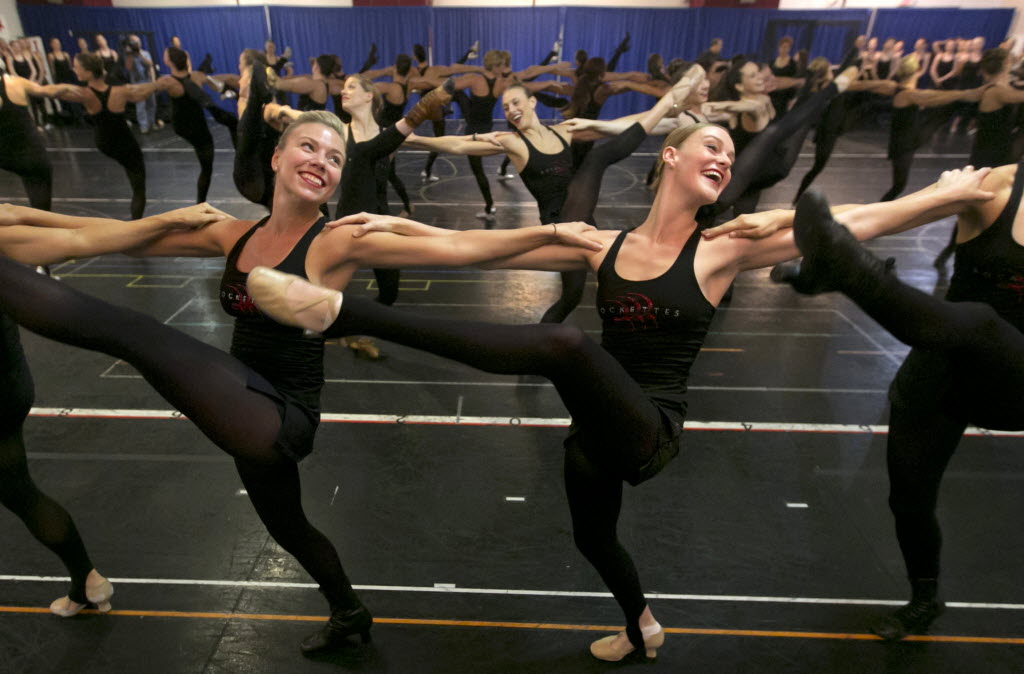 The Rockettes rehearse their “New York at Christmas” number from the 2014 Radio City Christmas Spectacular, in the rehearsal space of St. Paul the Apostle Church, in New York, today. (AP Photo/Richard Drew)