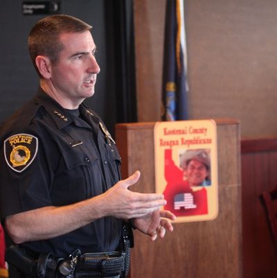 Coeur d’Alene Police Chief Lee White speaks to the Kootenai County Reagan Republicans at their regular weekly noon luncheon at the Fedora restaurant in Coeur d’Alene. (Photo: Duane Rasmussen)
