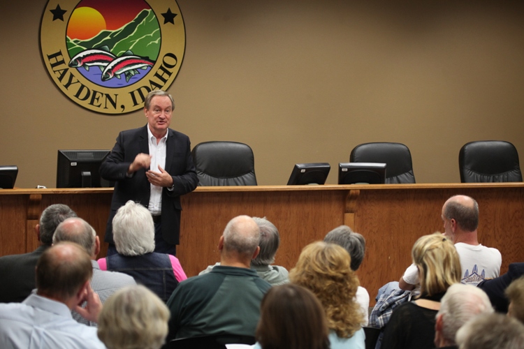 U.S. Sen. Mike Crapo talked to a crowd of people at a townhall meeting in the Hayden City Council chambers Friday. Crapo was interested in discussing the national deficit, while some listeners wanted to discuss contrails . Earlier, Crapo met with Kootenai County commissioners Friday, to talk about rural school funding here. (Photo: Duane Rasmussen)
