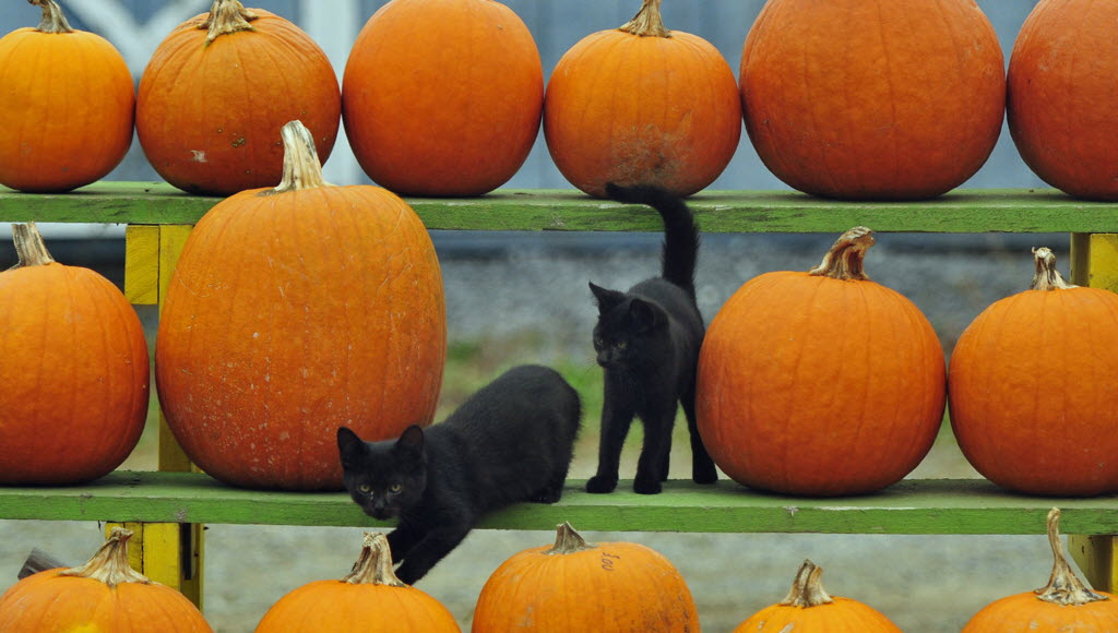 Facts: Sibling kittens Sam and Boo enjoy a playful romp around pumpkins Monday at Shatzer’s Fruit Market, in Chambersburg, Pa. You write the cutline. (AP Photo/Public Opinion, Markell DeLoatch)