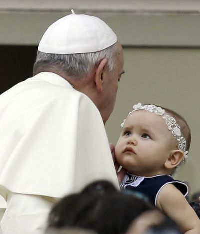 Facts: Pope Francis holds a baby as he arrives in St. Peter’s Square at the Vatican Wednesday. You write the cutline. (AP Photo/Gregorio Borgia)
