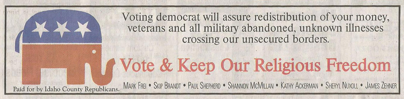 An ad paid for by the Idaho County Republicans now running in the Idaho County Free Press takes partisan rhetoric to a new level: It says, “Voting democrat will assure redistribution of your money, veterans and all military abandoned, unknown illnesses crossing our unsecured borders. Vote & Keep Our Religious Freedom.” The pitch is accompanied by a red, white and blue GOP elephant, and lists the names of local legislative and county GOP candidates Mark Frei, Skip Brandt, Paul Shepherd, Shannon McMillan, Kathy Ackerman, Sheryl Nuxoll and James Zehner.
