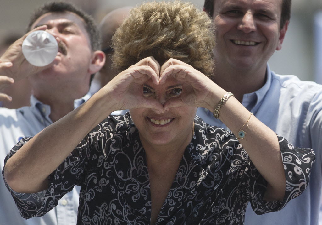Brazil’s President Dilma Rousseff flashes a hand gesture during a rally for her re-election campaign in Rio de Janeiro, Brazil, Monday. You write the cutline. (AP Photo/Silvia Izquierdo)