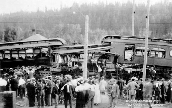 July 31, 1909: Two passenger trains from the Electric Line of the S&IE crashed head-on at Gibbs, about a mile up Northwest Boulevard from downtown Coeur d’Alene, killing 16 and injuring more than 100. The trains were crowded because travelers were attending a lottery for purchasing Coeur d’Alene Indian land. (Photo courtesy: Museum of North Idaho)