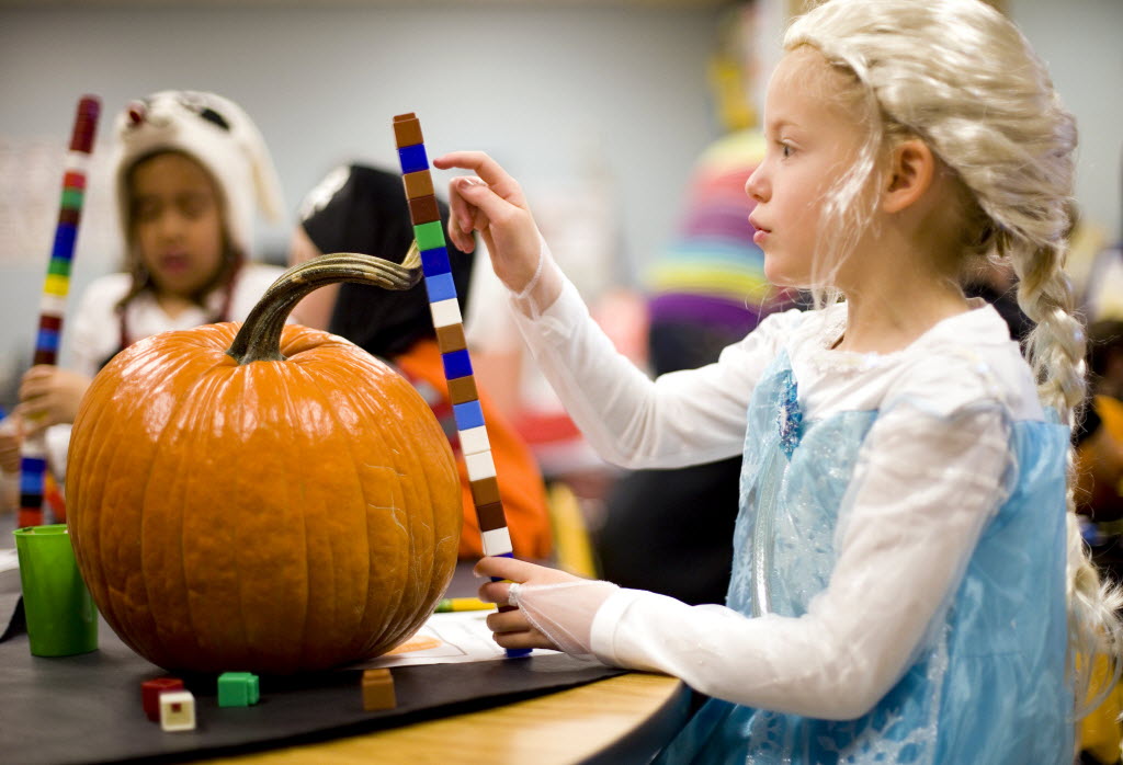 Kindergartner Adelaide Quist measure how many blocks tall a pumpkin is during a pumpkin math lesson at Lena Whitmore Elementary School in Moscow Thursday. Students in the class were dressed in their Halloween costumes after holding a Halloween parade for other students in the school. (AP Photo/Moscow-Pullman Daily News, Geoff Crimmins)