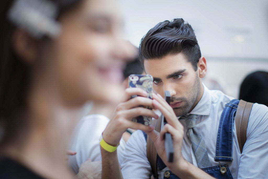 A spectator takes a cell phone picture of a model before the Creatures of the Wind Spring 2015 collection is shown during Fashion Week earlier today in New York. (AP Photo/John Minchillo)