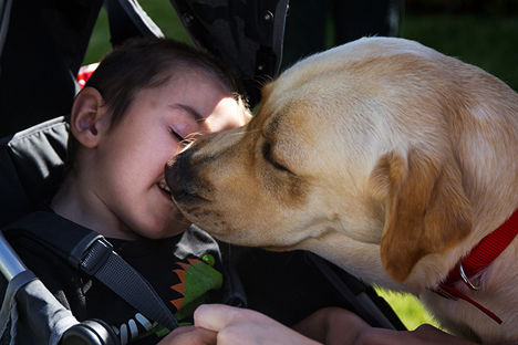 Silas, a cross between a Labrador Retriever and Golden Retriever licks Luke Ackerman, 6, face during the family’s welcome party for Silas on Saturday afternoon. Silas was a gift to Luke, who is diagnosed with a degenerative brain disease called GM1 Gangliosidosis, through the Make-A-Wish Foundation. Story here . (Coeur d’Alene Press photo: Tess Freeman)