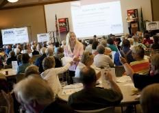 (SR photo by Tyler Tjomsland: Cheryl Reed Weber, a community outreach director with AARP, hands out sign-up sheets for the Fraud Watch Network)