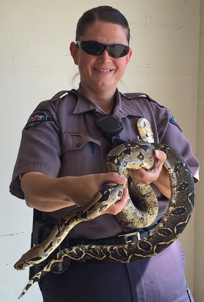 Animal control officer Kimberly Mink holds a boa constrictor that went missing and was found in Nampa. The 9-foot Columbian boa constrictor named Trinity that escaped its southwest Idaho cage was found after two days on the loose. Trinity didn’t appear to have traveled far after being spotted Sunday in the garage that holds the snake’s cage. Jittery neighbors with small pets and children went on alert after the owner reported to Nampa police on Saturday that the snake disappeared Friday afternoon and hadn’t eaten for three weeks. (AP Photo/Nampa Police Dept.)