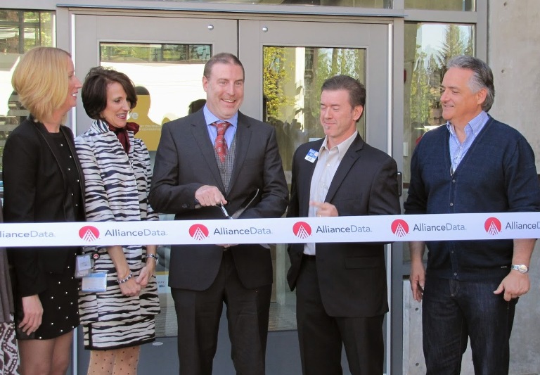 Mayor Steve Widmyer, right, joins Alliance Data corporate officials at the ribbon cutting Monday. Widmyer welcomed Alliance corporate leaders and dozens of staff members during a ceremony at their 44,500-square-foot call center at 745 W. Hanley Ave., in northern Coeur d’Alene. More here. (Coeur d’Alene Today photo: Keith Erickson)