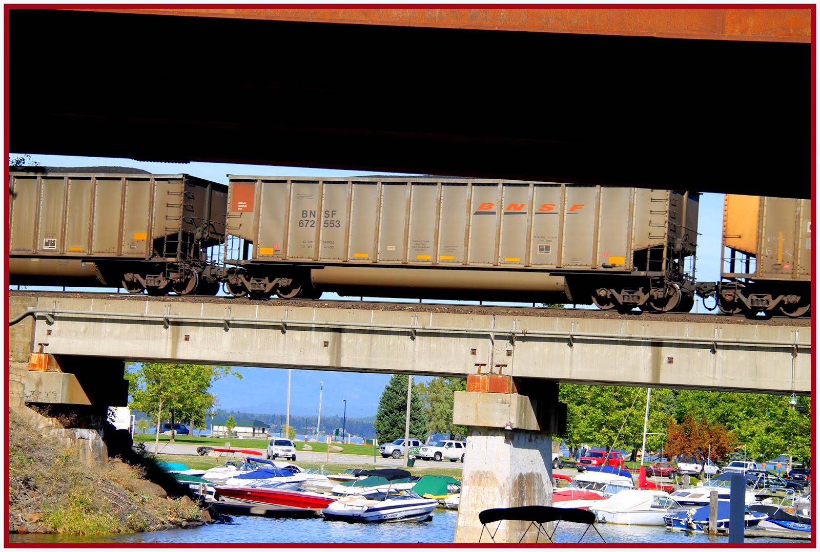 Marianne Love/Slight Detour snapped a number of photos during a recent walk along the Sandpoint area bike path, including this one of a BNSF train on the tracks at a marina.