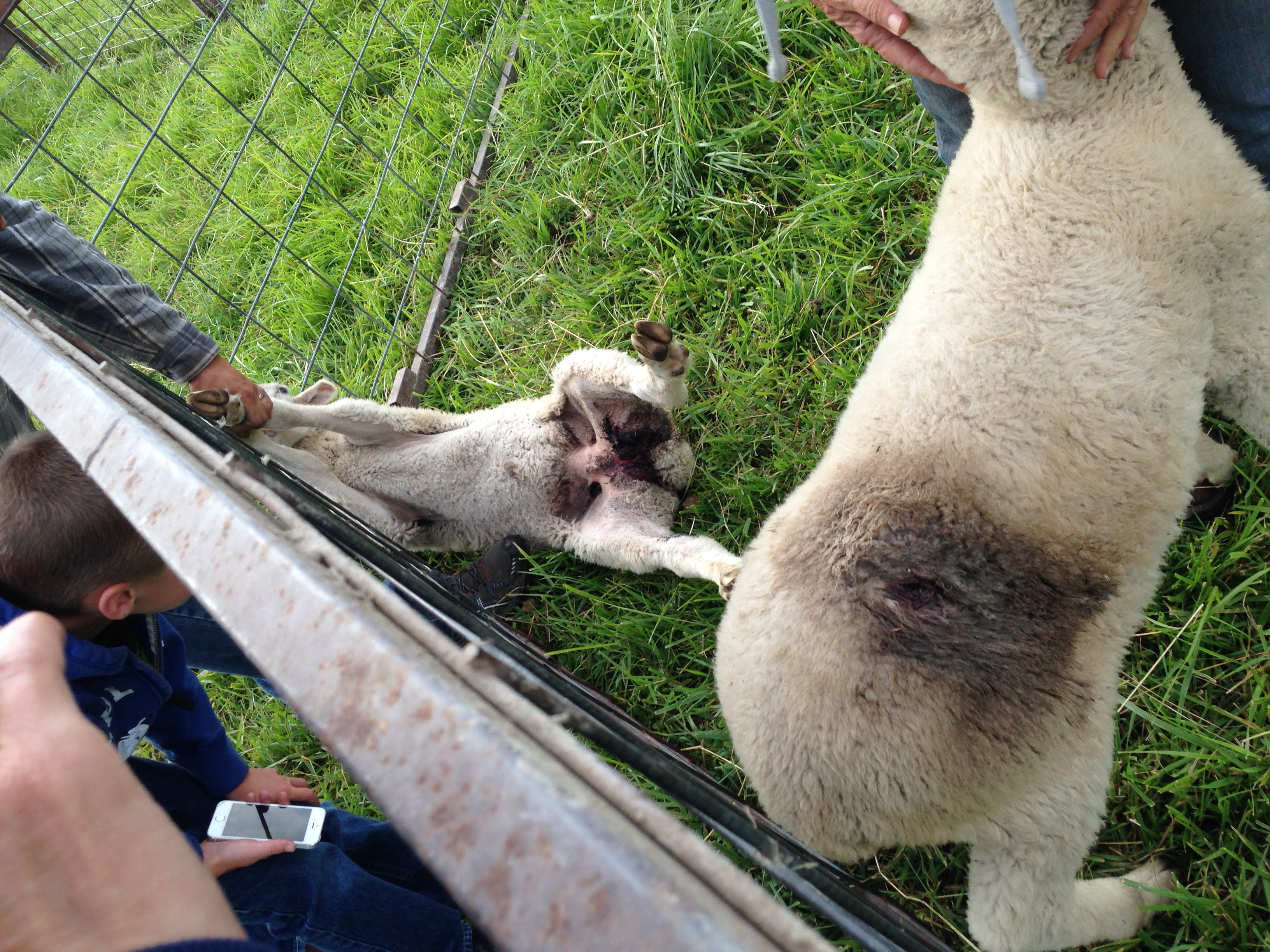 Wounded sheep owned by Dave and Julie Dashiell are examined in a holding pen after being brought out of private timber company grazing lease in southern Stevens County where wolves killed at least 24 of the ranchers' sheep from a flock of about 1,800 in the last two weeks of August, 2014.