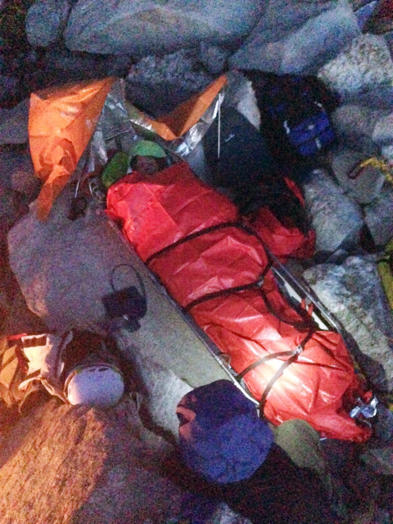 Rescue team members sit with a 36-year-old Ammi Midstokke after they had extricated her from beneath a two-ton boulder that had rolled onto her leg Saturday, on a trail leading from Chimney Rock, a prominent outcropping in the Selkirks, east of Priest Lake. The Coeur d’Alene Press reports the woman was hiking with a man and became stuck Friday afternoon after the large boulder on the side of the mountain shifted under her weight. Priest Lake Search and Rescue team members and the Bonner County EMS Wilderness Response Team reached her Friday evening around midnight, freed her and tended to her injuries, but had to wait for daybreak before she could be taken out by helicopter. Story here. (AP Photo/Priest Lake Search & Rescue, Mike Nielsen)