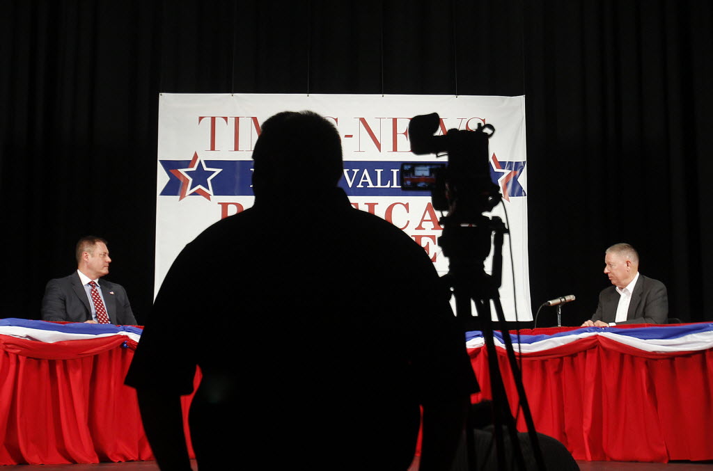 Libertarian candidate John Bujak, left, and Democratic candidate A.J. Balukoff face off during the gubernatorial debate at Canyon Ridge Auditorium Wednesday evening in Twin Falls. Story here. (AP Photo/The Times-News, Drew Nash)