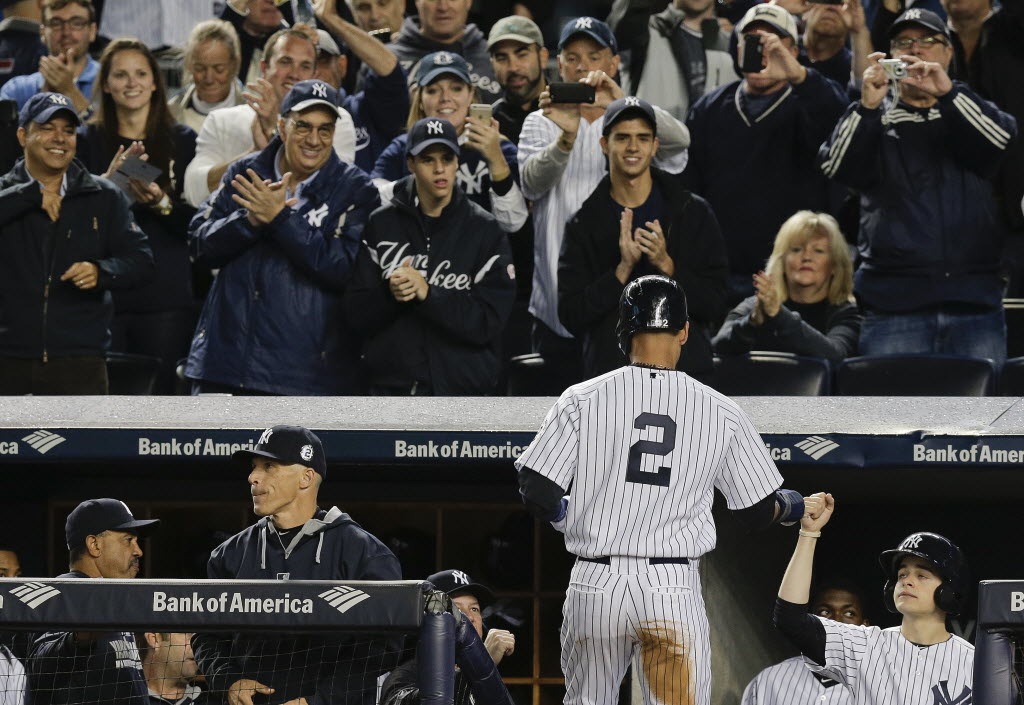 New York Yankees’ Derek Jeter is greeted by teammates and applauded by fans as he enters the dugout after scoring against the Baltimore Orioles in the first inning a baseball game in New York tonight. Jeter, the New York captain, is playing his final home game as a Yankee. He will retire after weekend games on the road. (AP Photo/Julie Jacobson)