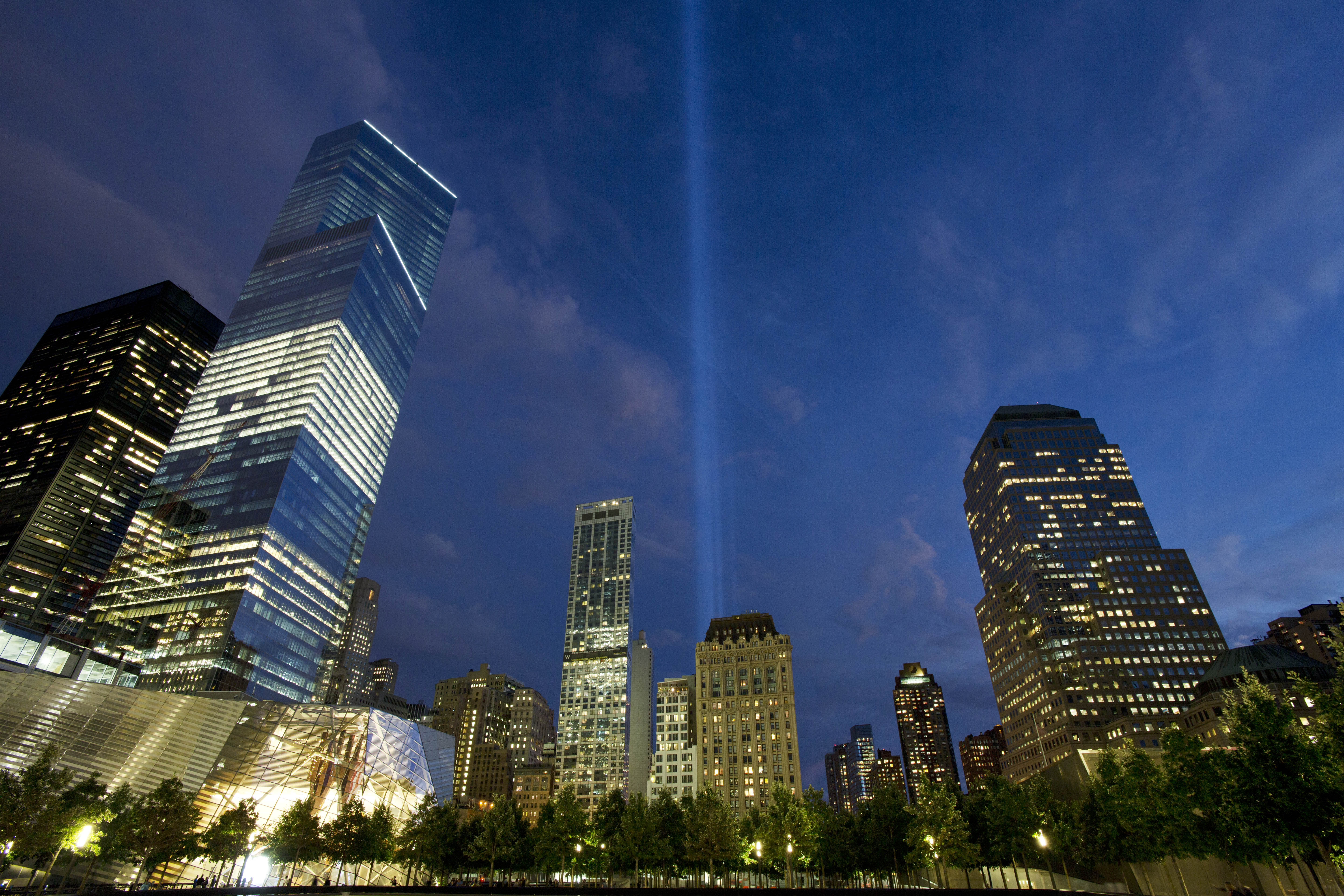 (S-R photo: T he Tribute in Light rises behind buildings adjacent to the World Trade Center in New York. )