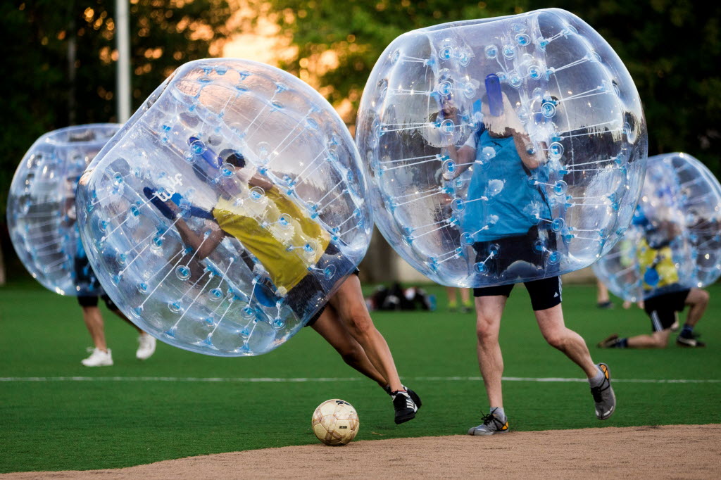 Players encased in bouncy, blue orbs push downfield during Seattle’s first “Bubble Futbol” tournament in Seattle. Introduced in Europe, the growing sport was spotlighted on “The Tonight Show with Jimmy Fallon.” You write the cutline. (AP Photo/seattlepi.com, Jordan Stead)