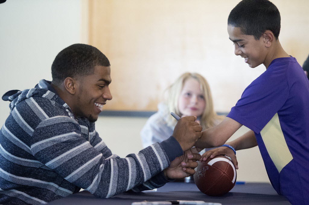 Former Gonzaga Prep standout Bishop Sankey, now with the Tennessee Titans, laughs as he signs Elias De Leon’s, 10, arm, along with a football on Tuesday in Spokane. SR colleague Greg Lee interviewed Sankey Wednesday. (SR photo: Tyler Tjomsland)