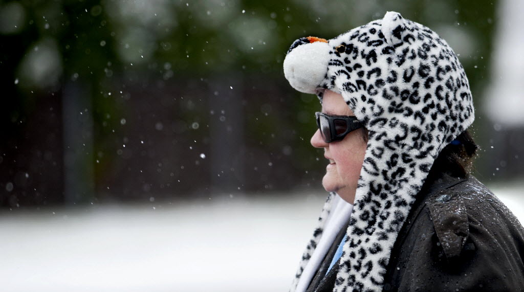 “I just love these crazy things,” said Ruthie Taylor about her animal hat as she walked through the snow in Post Falls Monday. SReporters Mike Prager & Kip Hill report on crazy snow that greeted Inland Northwesterners Monday morning here. (SR photo: Kathy Plonka)