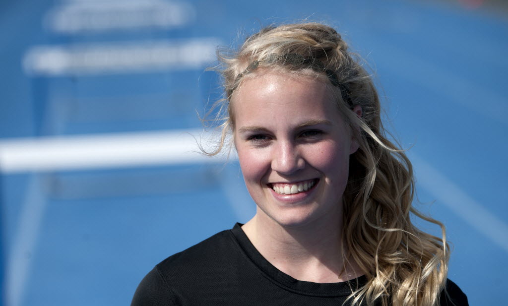 Coeur d’Alene High School hurdler Kaitlyn Gunnerson last year’s state champ last talked about the 100 and 300 hurdles during practice on Tuesday. She has a scholarship from BYU. (SR photo: Kathy Plonka)