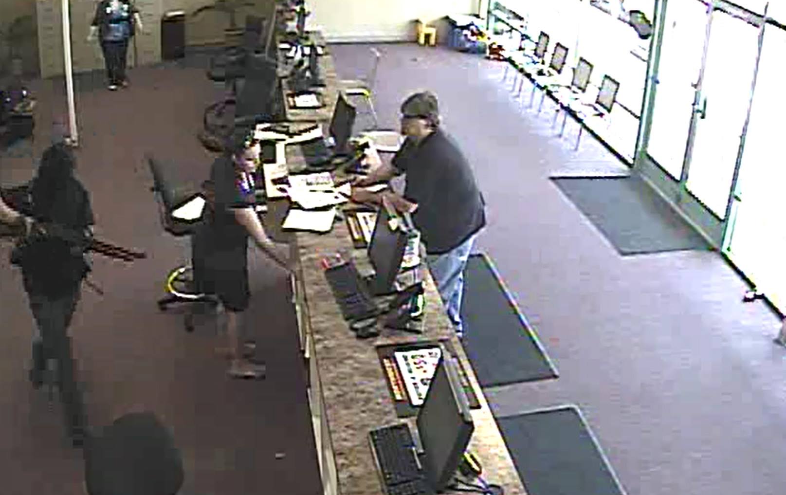 He steals from a cash drawer, forces a customer and employees to sit down and then leaves. No one was hurt.
