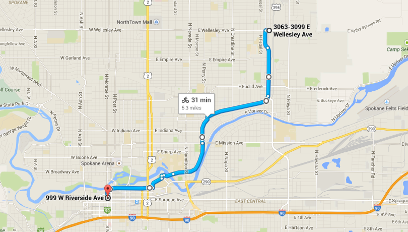 My plan was to ride from my hovel in Hillyard, down Market, over Indiana (with its pretty view and its convenient bicycle lane) and then meet up with the Centennial Trail down by Avista, which would lead me practically to the SR’s front doorstep.