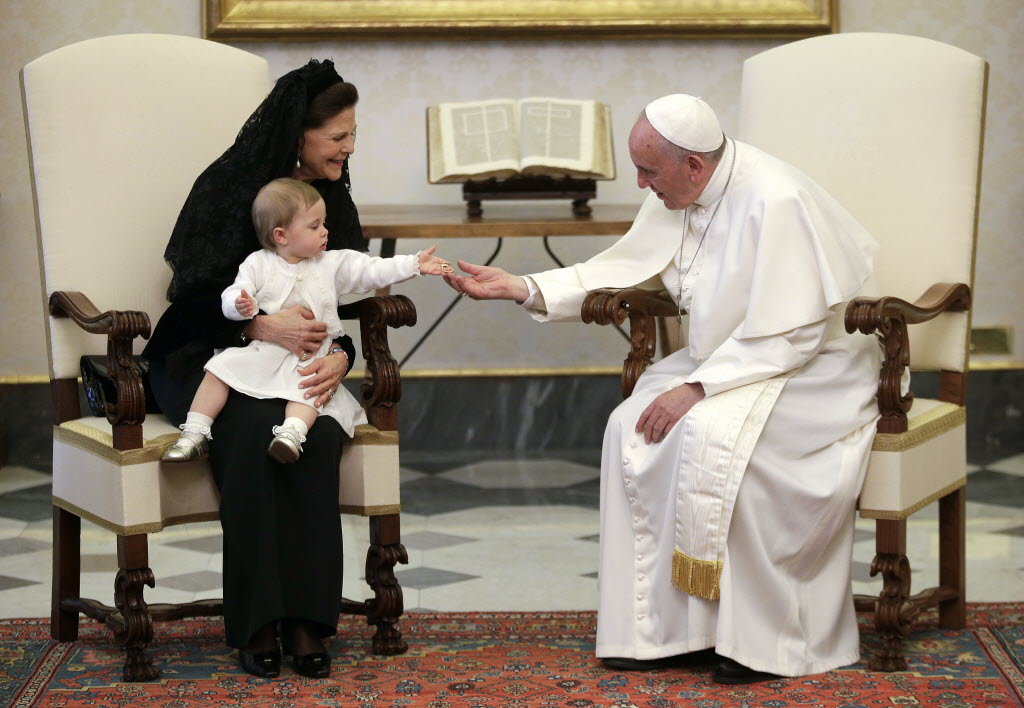 Pope Francis touches the hand of Sweden’s Princess Leonore as he meets with Sweden’s Queen Silvia during a private audience in the pontiff’s studio, at the Vatican, earlier today. You write the cutline. (Max Rossi/Pool photo via AP)