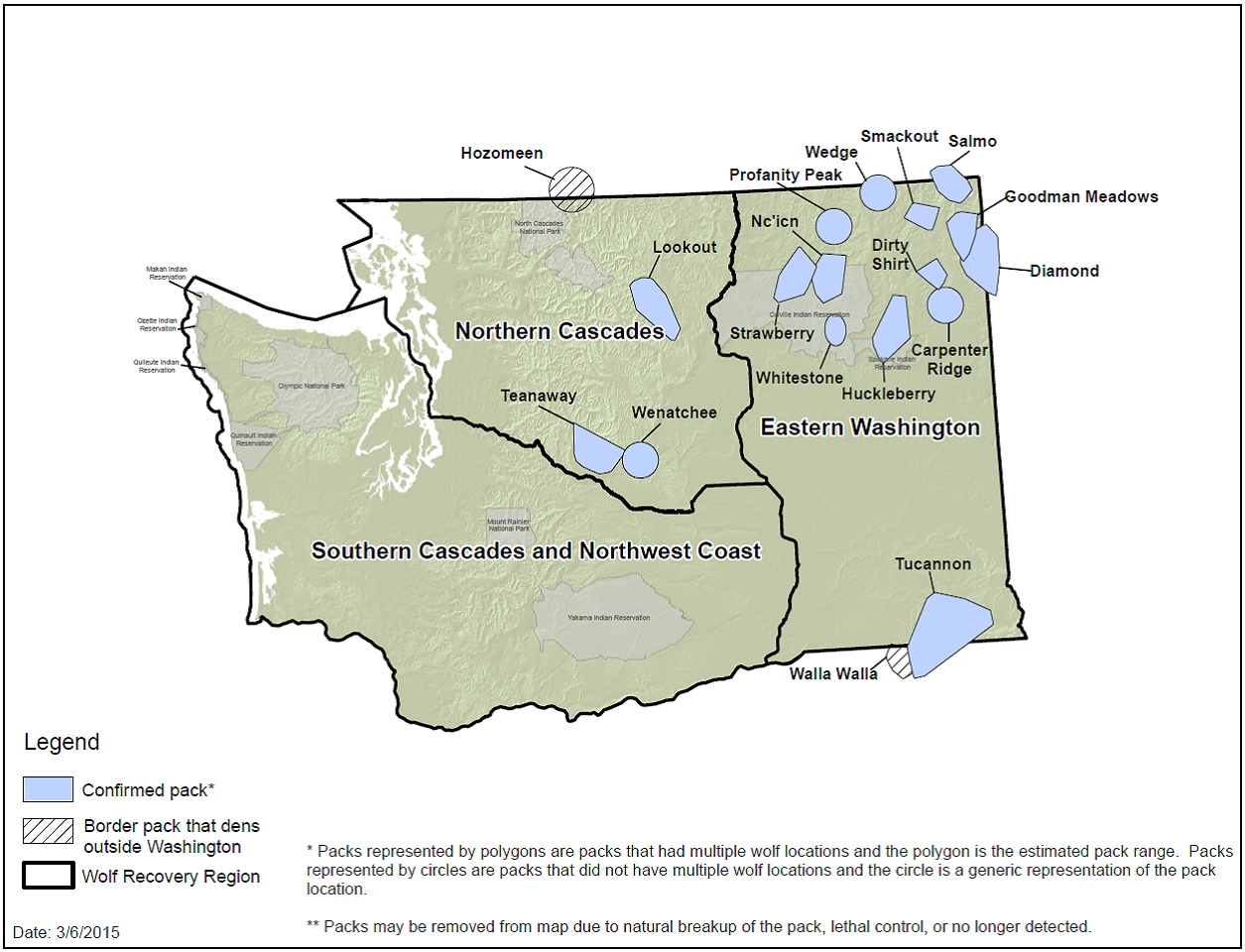 Wolves can be delisted from state endangered species protections after a specified number of breeding pairs are in each of three areas of the state. So far, none has been documented in Western Washington.