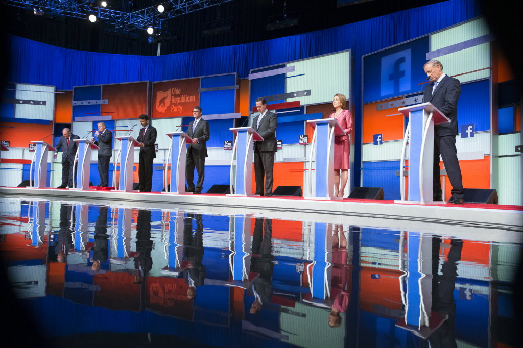 Republican presidential candidates from left, Jim Gilmore, Lindsey Graham, Bobby Jindal, Rick Perry, Rick Santorum, Carly Fiorina, and George Pataki participate in a pre-debate forum at the Quicken Loans Arena, today in Cleveland. Seven of the candidates have not qualified for the primetime debate. Wall Street Journal story here. (AP Photo/John Minchillo)