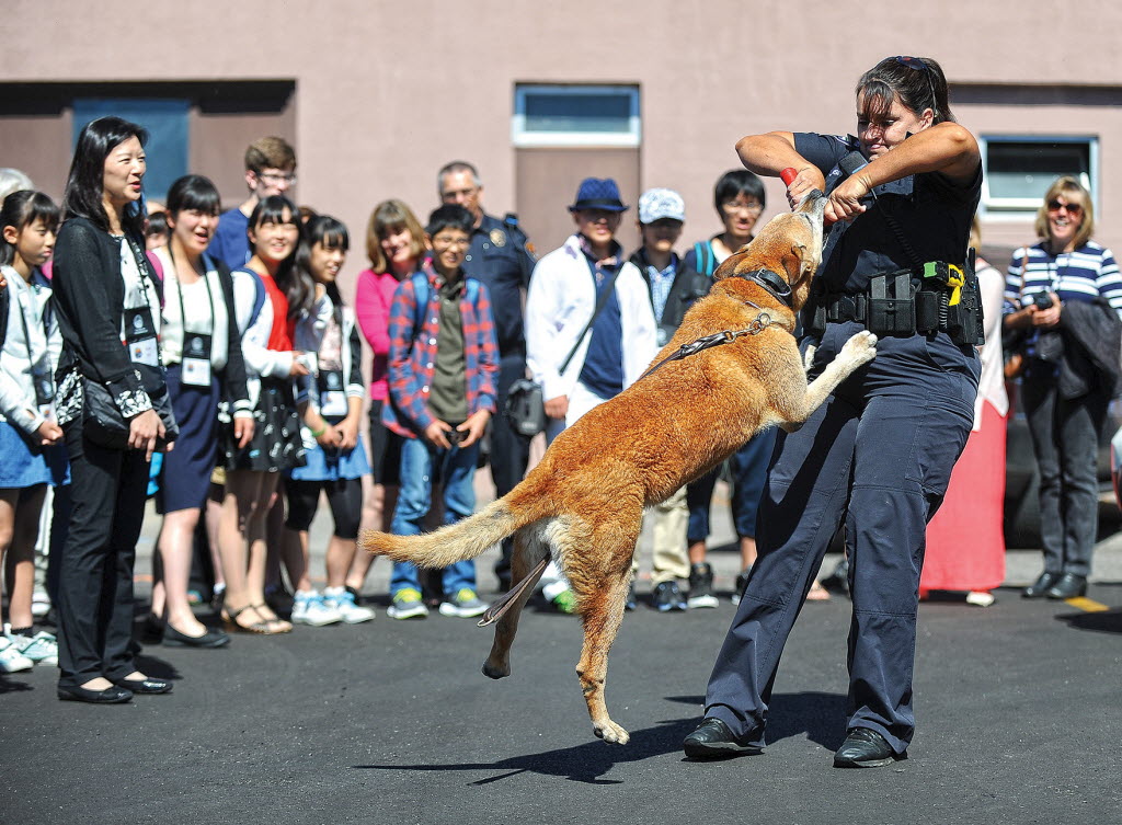 Idaho Falls Police Department K-9 Officer Jeanette Johnson gives a demonstration of the jaw strength of Zeke, a 10-year-old Belgian malinois, during the Japanese “sister city” of Tokai, Japan youth delegates’ tour in Idaho Falls. (Pat Sutphin/Idaho Post-Register via AP)