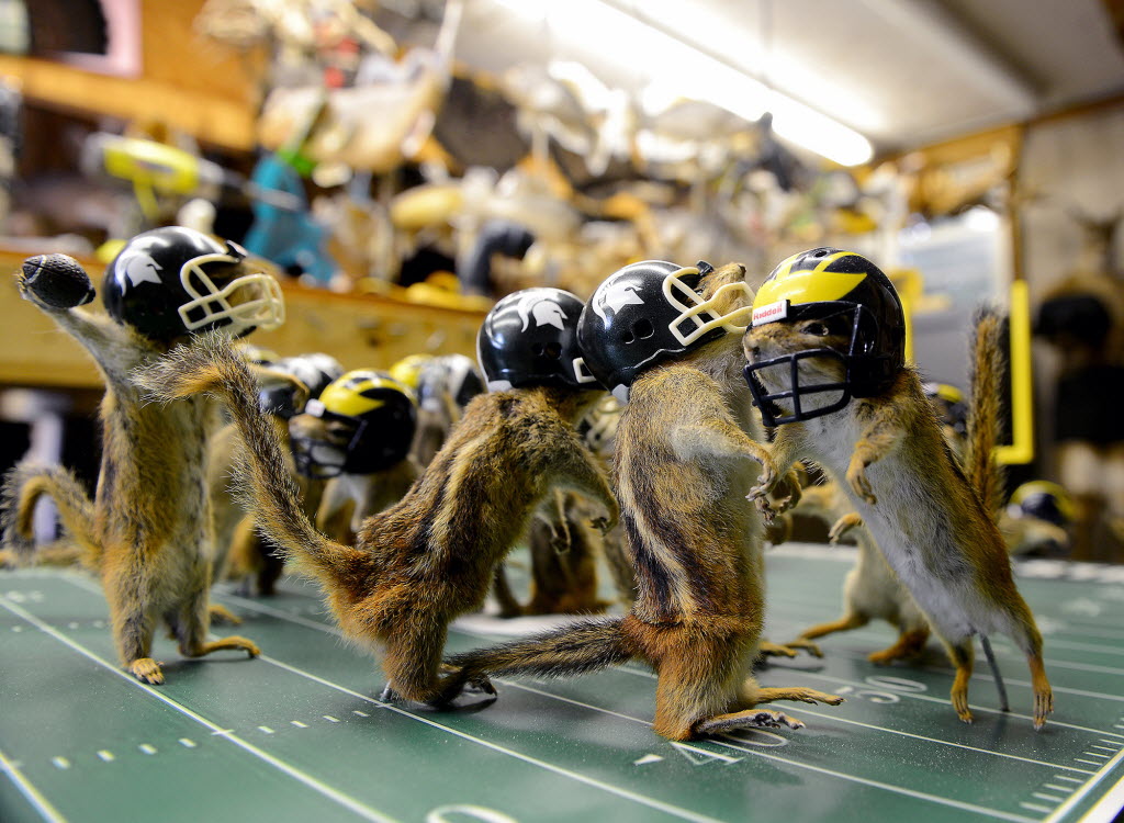 The quarterback is poised to pass as 21 other stuffed chipmunks “play” an MSU vs. UM football game in Nick Saade’s taxidermy shop in Lansing, Mich. Saade said these are nuisance chipmunks who were trapped in cabins up North. He doesn’t like to see anything go to waste, so he decided to make the football display out of them. Saade, a full-time taxidermist for 18 years, recently made the football display with 22 stuffed chipmunks wearing little Spartan and Wolverine helmets. You write the cutline. (Dave Wasinger/Lansing State Journal via AP)