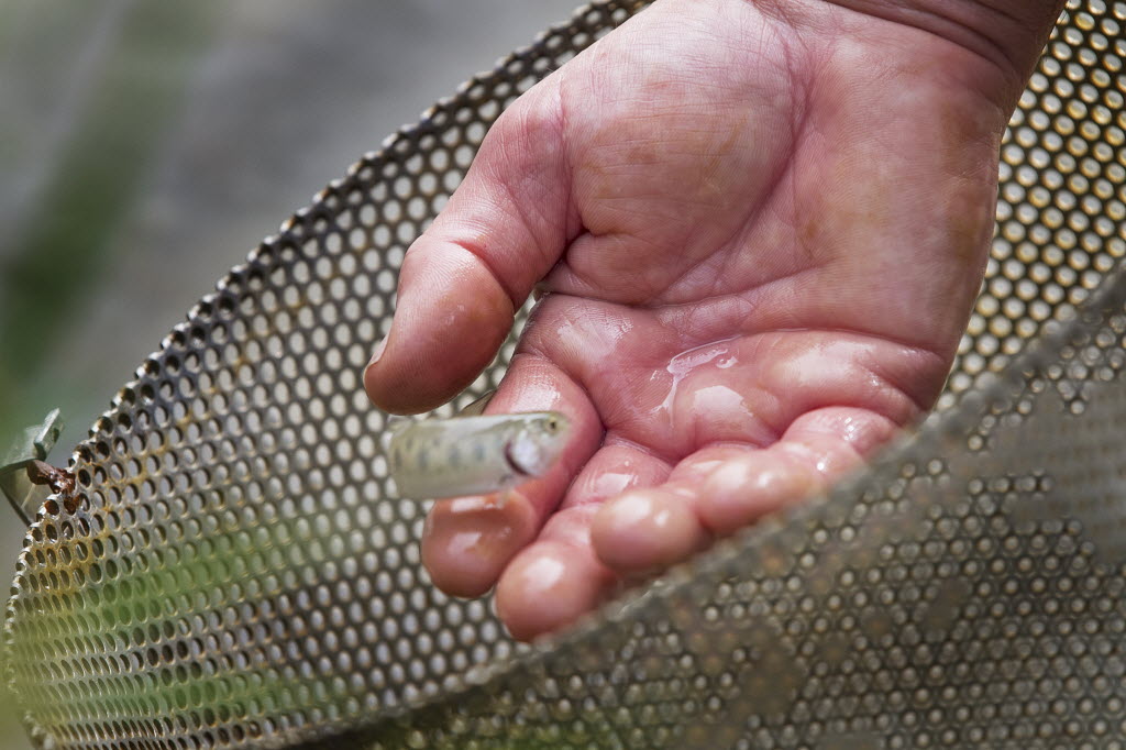 A fingerling trout removed from a trap in the contaminated waters of the Animas River in Durango, Colo., leaps from the hands of Colorado Parks and Wildlife’s Aquatic Biologist Jim White today. The fingerling was shown to Colorado Governor John Hickenlooper during a tour of the area. Story of EPA-caused spill here. (Shaun Stanley/The Durango Herald via AP)