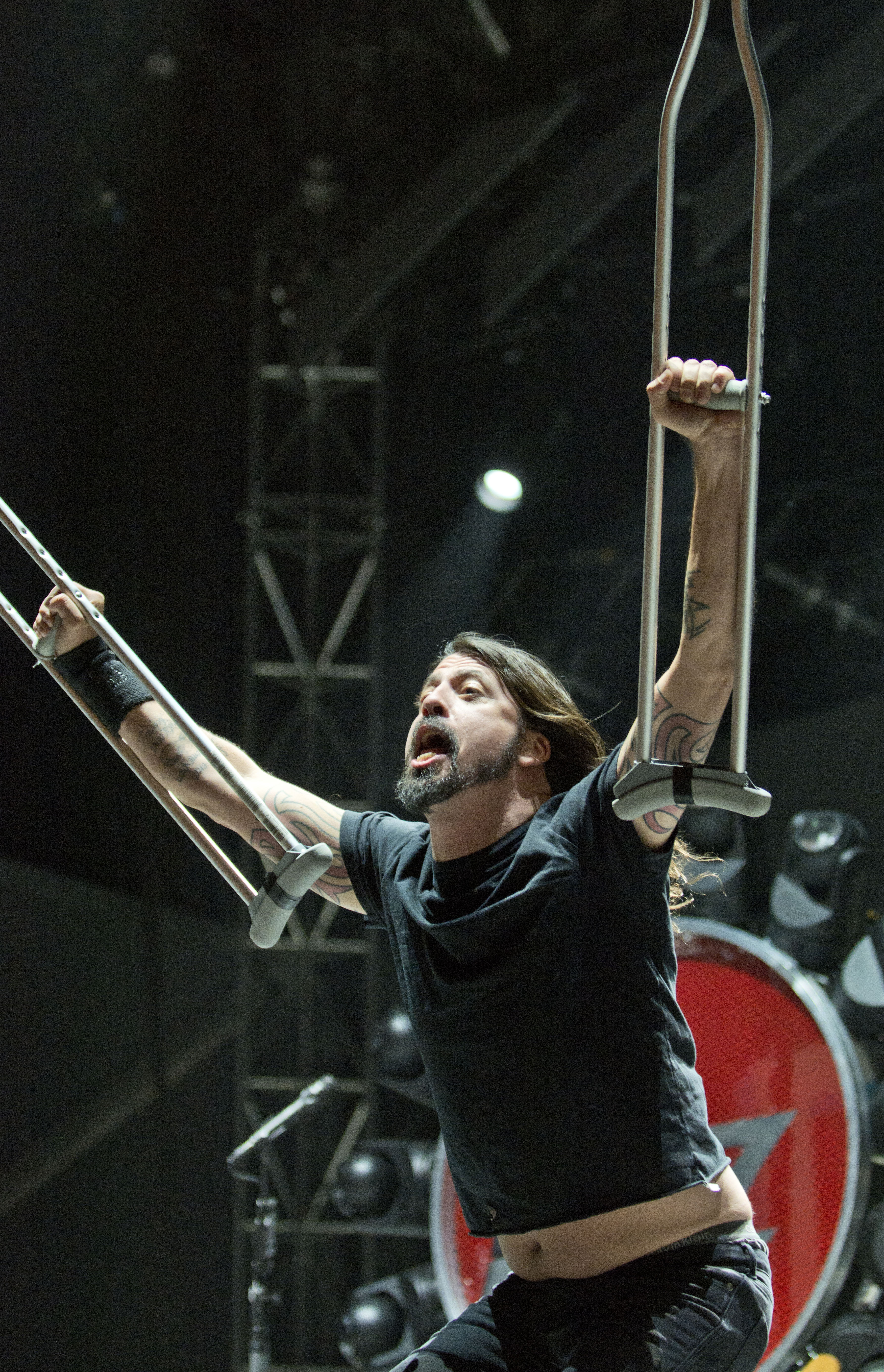 Down but not out: Foo Fighters frontman Dave Grohl takes the stage Friday night with his crutches aloft at the Gentlemen of the Road Stopover festival in Walla Walla. Grohl fell onstage in Sweden in June and fractured his foot, but he had a cast put on his leg during that show and finished the performance. The Walla Walla festival continued Saturday with headliners Mumford and Sons.